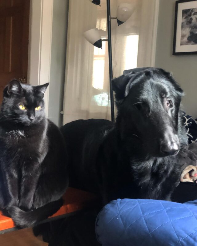 Lorsque la maman fourrure et plume Robin Wagner a adopté le mélange berger allemand / lévrier Blaze, Satin le chat a accueilli le chien extra-large dans leur maison de Burlington, Vermont, les pattes ouvertes. Blaze était grand et avait l’habitude de marcher sur le chat noir, mais cela ne dérangeait pas Satin. Elle avait trouvé un copain à quatre pattes avec qui passer ses journées, même s’il était aveugle d’un œil et faible de l’autre. Et comme le peu de vision que Blaze avait échappé, Satin serait toujours là pour aider son ami à trouver son chemin.