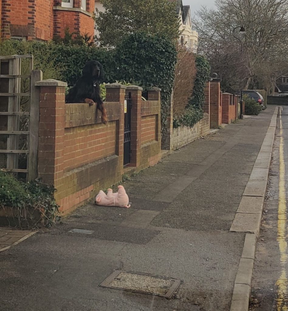 Claire Cummings de Basingstoke, en Angleterre, est tombée sur une telle situation en conduisant. Tout d’abord, elle a remarqué un cochon en peluche solitaire sur le trottoir. Puis elle vit un chien noir et marron tristement penché sur le mur qui le regardait fixement. De toute évidence, ce chien avait été séparé de son jouet préféré.